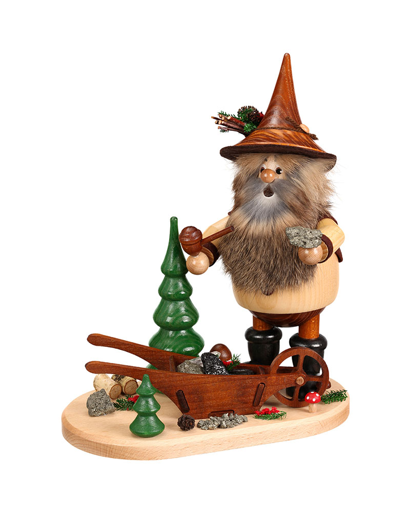 - Ausgestattet mit einem Rauchauslass, ermöglicht der „Erzwichtel mit Erzkarre“, Räucherkerzen zu verwenden, die sanft duftenden Rauch durch den Mund des Wichtels abgeben.